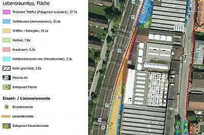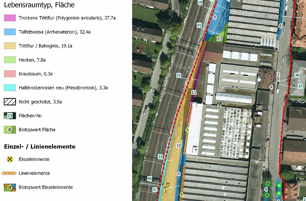 Naturaqua PBK hat im ganzen Bearbeitungsperimeter eine Lebensraumkartierung durchgeführt und den ökologischen Ersatzbedarf anhand der aktuellen Bewertungsmethode für Eingriffe in schutzwürdige Lebensräume festgestellt.